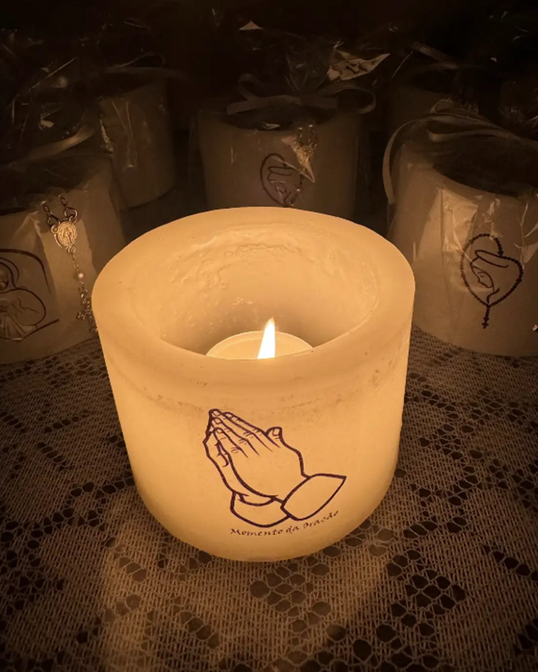 Vela em forma de luminária, a vela é oca e envolta de uma camada expessa de parafina especialmente desenvolvida para que não derreta, é composta imagens: Nossa Senhora, Momento da Oração e Jesus, sendo impressos em papel especial para ser inserido em meio a parafina, *não sendo plástico ou adesivo, aroma alecrim. Para acender é composta de uma mini vela de 2cm de altura com aproximadamente 3 horas de queima. Acompanha acendedor a gás.