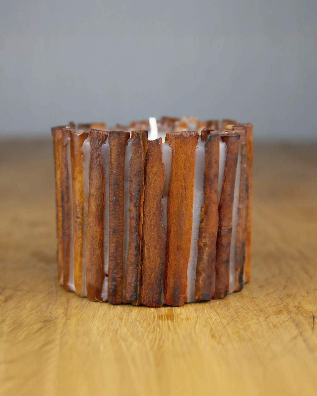 Vela exclusiva feita a mão e com ingredientes de especiarias e esta contém canela pau, com aroma de canela. Está vela é desenvolvida especialemente com parafina mais dura que no decorrer do uso não desintegra ou derreta seus ingredientes que estão no exterior imersos na vela, formando assim uma queima no meio da vela e após sua queima continua sendo um artigo de decoração e mesmo assim exalando seu aroma no ambiente e sue beleza é claro!