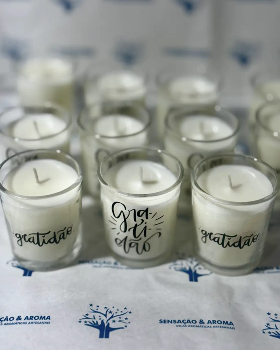 Velas com palavras positivas como: Fé, Amor, Alegria, Coragem, Gratidão e Abundânica.