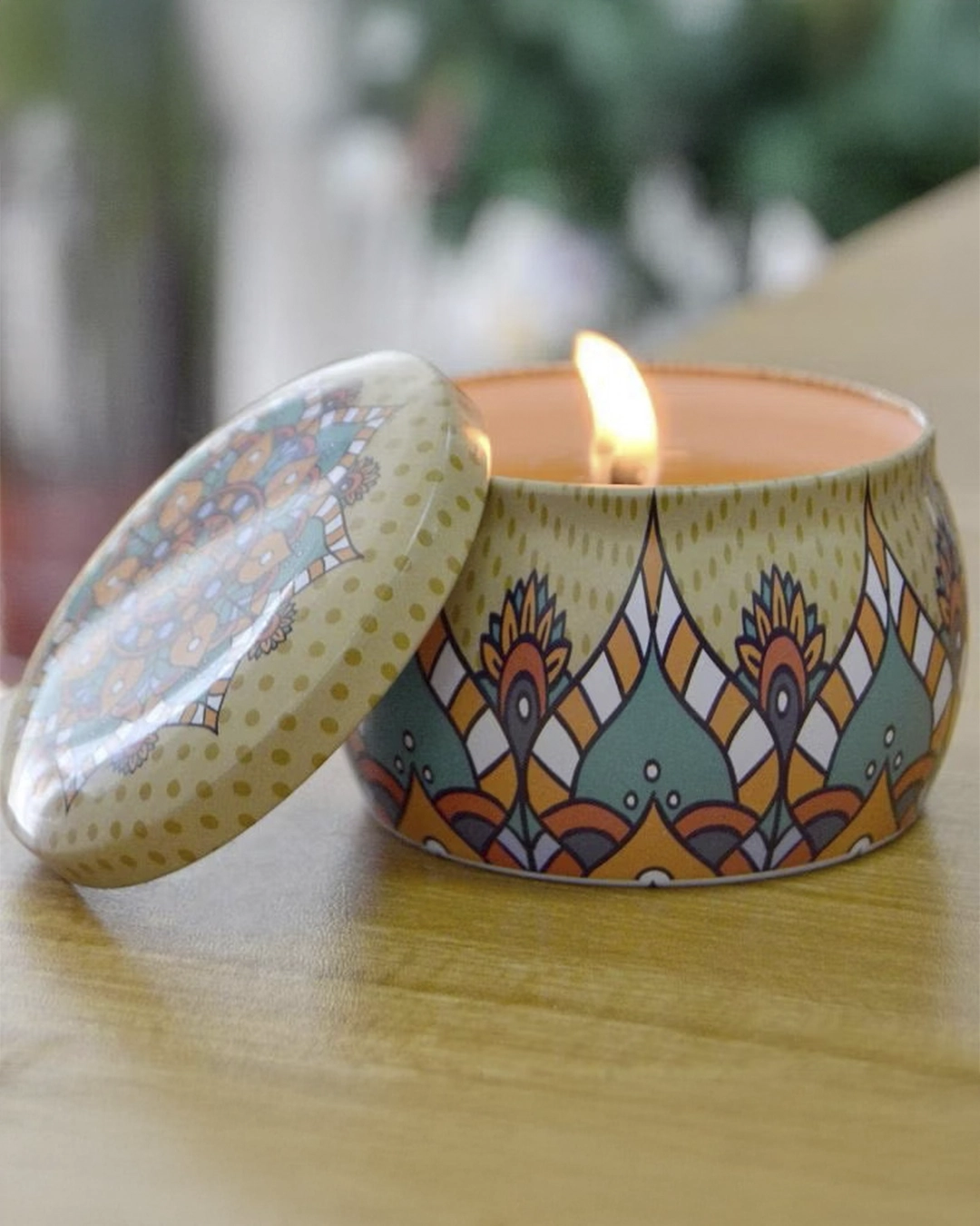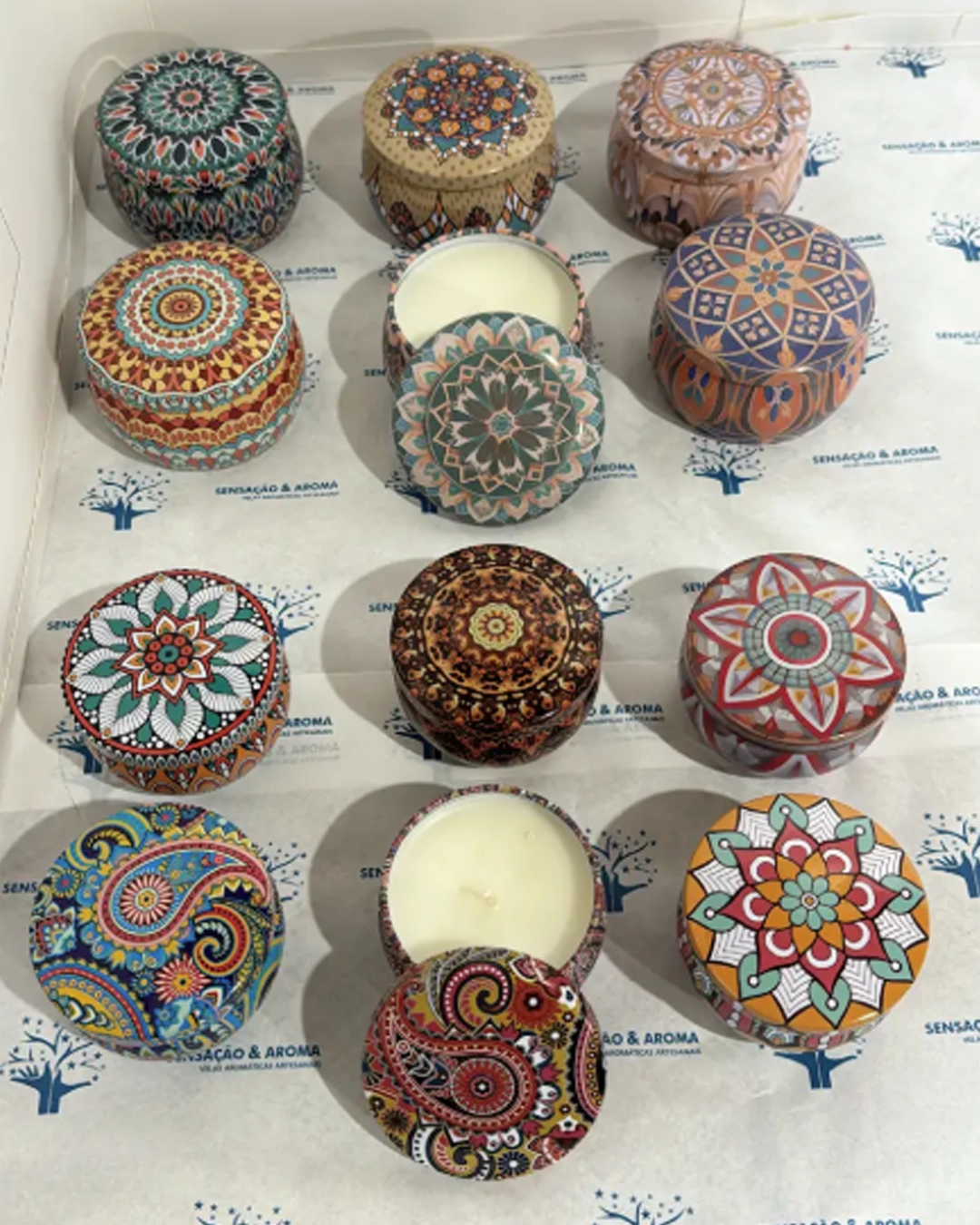 Vela na lata com pavio de algodão e parafina de soja, cada lata de mandala possui uma estampa e um aroma diferente uma da outra, neste combo de uma lata P e a lata M você adquire uma linda caixa para acompanhar este conjunto, podendo ser usado por você ou para presentear.