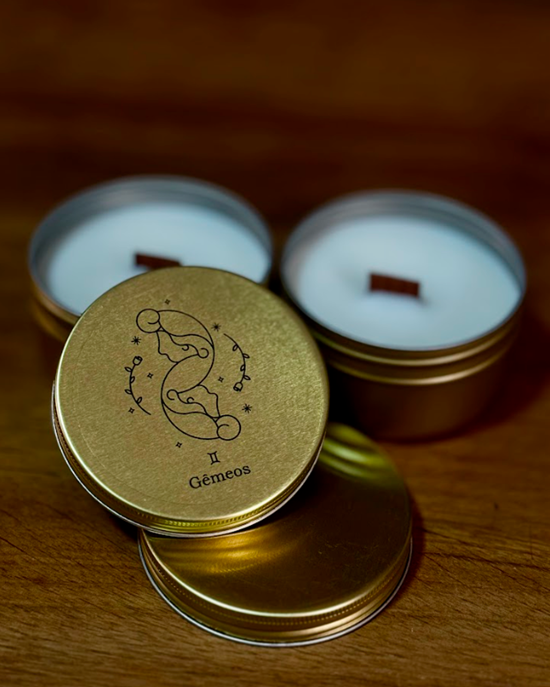 Vela 100% vegetal 90 ml de cera de coco e palma, pavio de madeira e essência especialmente elaborada para combinar com cada signo dos zodíacos.
