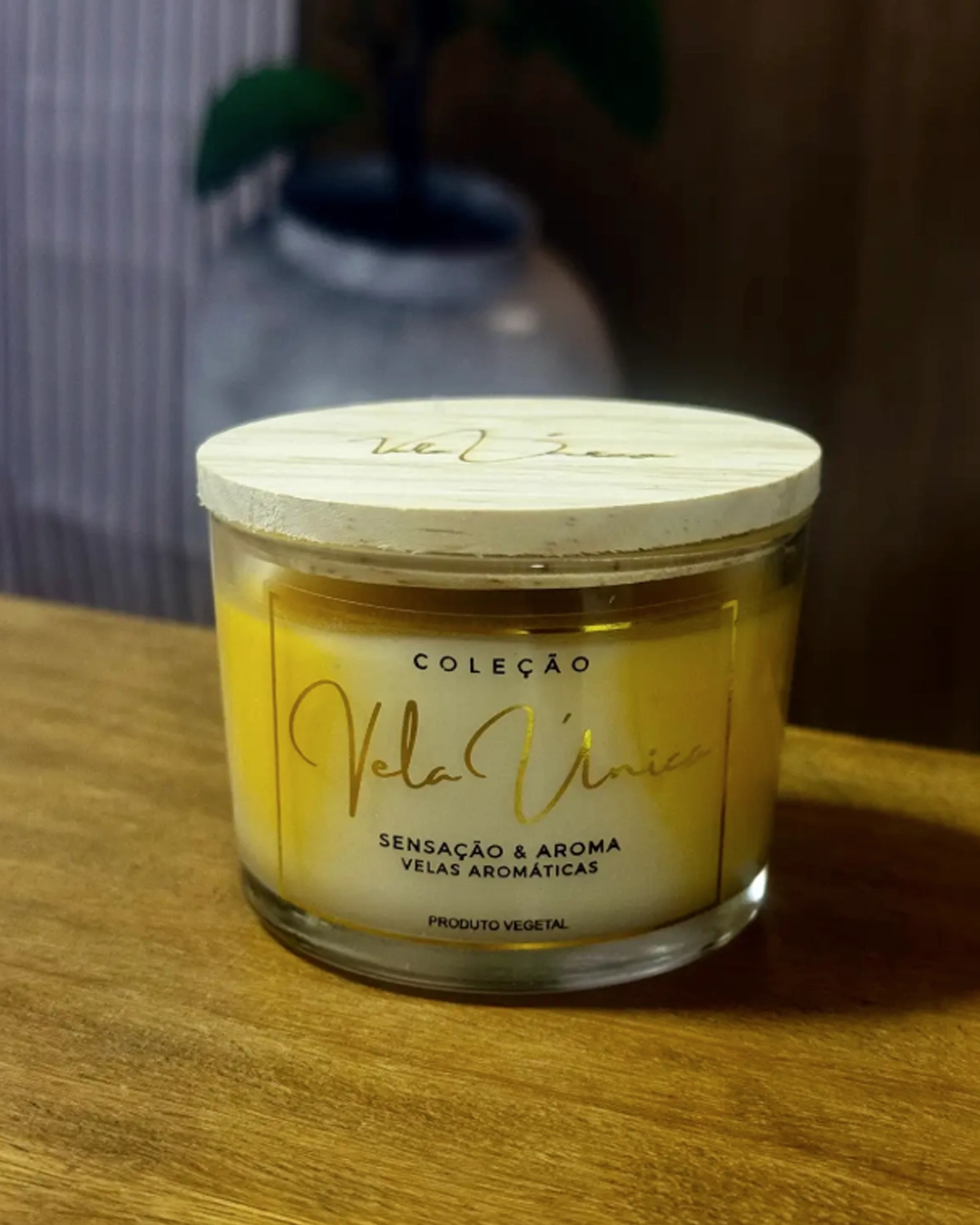 Vela 100% vegetal 90 ml cera de coco e palma, pavio de madeira e essência de Laranja, especialmente desenvolvida com nuances da cor da laranja formando assim essa bela imagem desta composição.